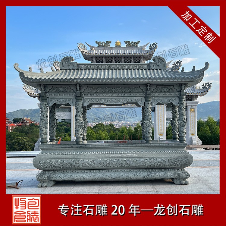 適用場(chǎng)景:青石石雕香爐在寺廟、宗祠等宗教場(chǎng)所中非常常見,其古樸典雅的色調(diào)能夠營造出莊重肅穆的氛圍。