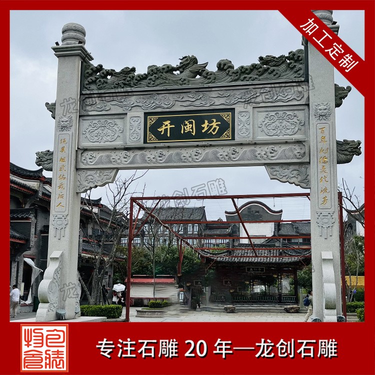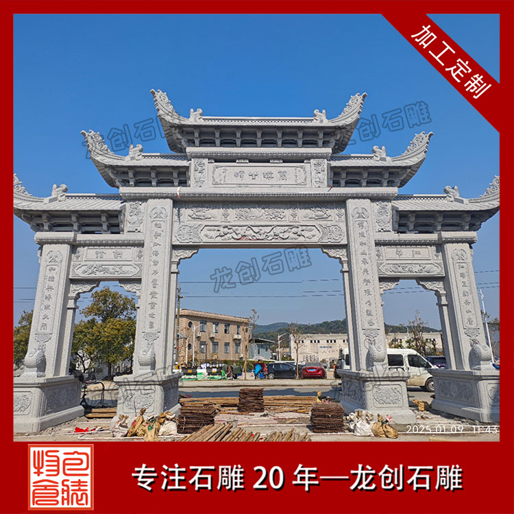 關(guān)注雕刻工藝:精湛的雕刻工藝是石雕牌坊的靈魂。觀察圖案線條是否流暢自然,深淺浮雕、透雕等工藝運(yùn)用是否恰到好處,人物、花鳥等雕刻形象是否栩栩如生。復(fù)雜精細(xì)的工藝會(huì)增加牌坊的藝術(shù)價(jià)值與成本,要在工藝水平與預(yù)算間找到平衡。