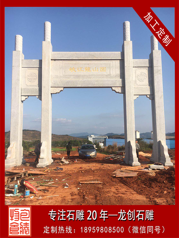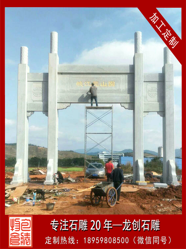 安裝地點:江西省吉安市峽江縣龍山園項目名稱:石雕牌坊材質(zhì):芝麻灰規(guī)格:三門石雕牌坊安裝時間:2019年3月