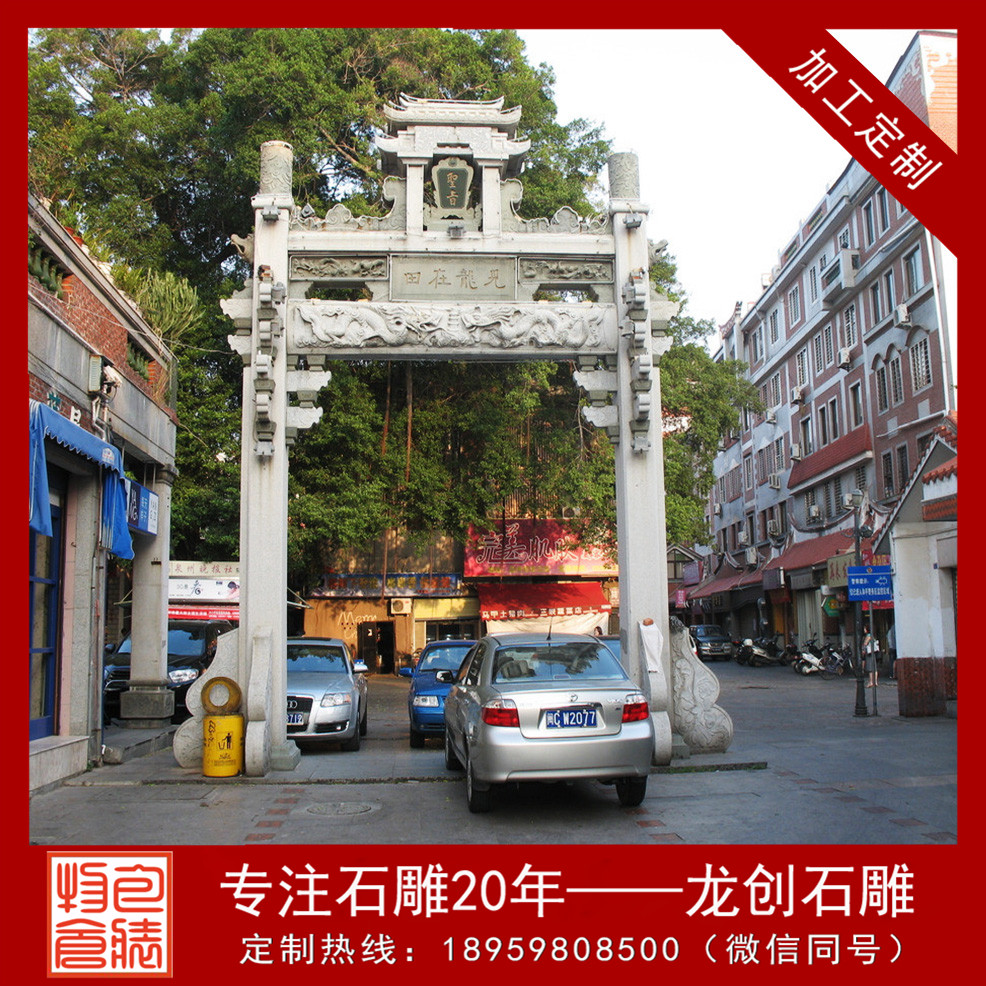 石雕石牌坊定制價格中了中國古建筑的較有特征的構件,設計尺寸隨著擺放地方的不同也有所不同,有的地方適合擺放總寬6.0米、7.0米、8.0米、9.0米、10.0米、12.0米、13.0米、16.0米、20.0米、28.0米等等,所以說牌坊設計尺寸要根據地方的不同來設計,找龍創石雕這種專業的石雕牌坊雕刻廠家會比較有保障些。