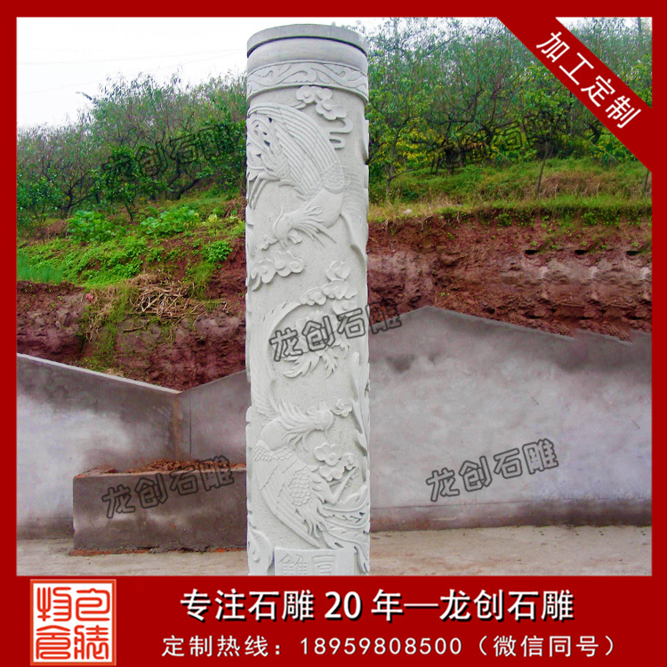 青石雕花圓柱 石雕龍鳳圓柱浮雕圖片