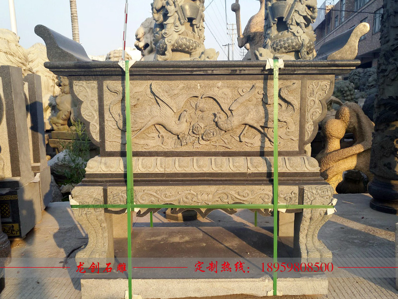 石雕供桌就是陳設供品的桌子,利用石材雕刻而成。石雕供桌常見款式為長方形,石頭材質屬于青石,面中間是一精致的供桌,雕刻一龍王看廟,高度約與方桌相等。祭祀時常供設香爐、蠟竿和擺放供品,此為石頭所制,故名石供桌。供桌常見幾種地方擺放,廳堂供桌、佛堂供桌、寺廟供桌、神臺供桌等,與其配套的有香爐、石鼎。