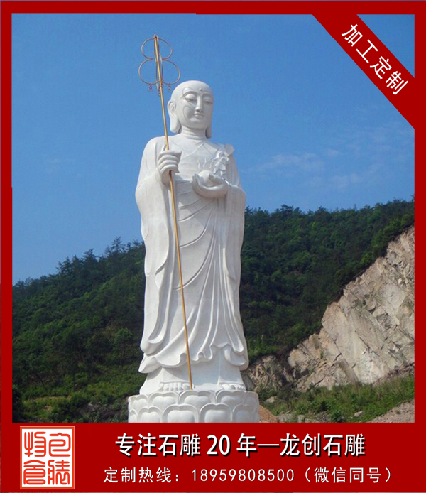 中國佛教寺院中的地藏菩薩形象很有特點,一般菩薩為頭戴寶冠、身披天衣、瓔珞裝飾的天人相。而地藏菩薩則多為光頭或是頭戴毗盧冠,身披袈裟的出家僧人之相。一手持錫杖,一手持蓮花,或是手持幡幢、寶珠等。