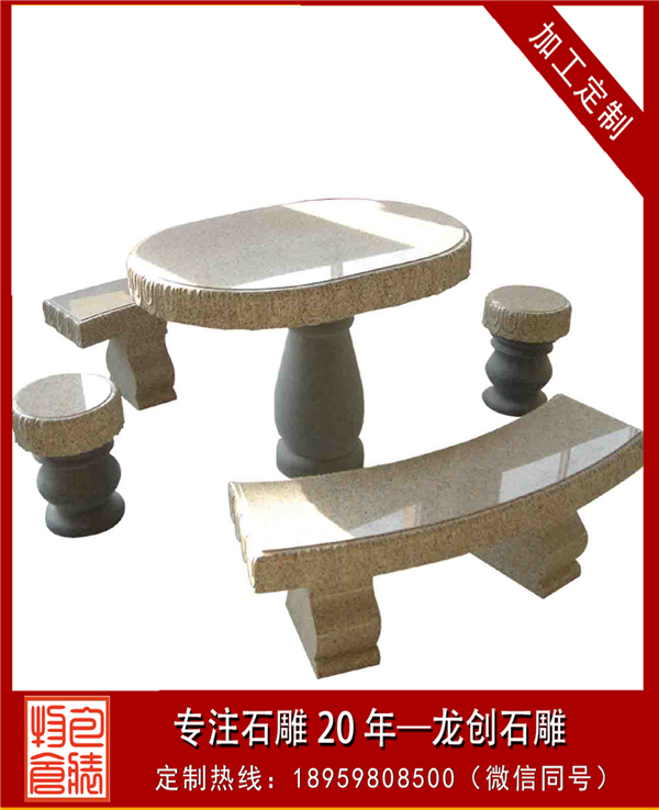利用石材的石桌椅雖然堅硬,但是可塑性強,不易損壞,可制作造型多樣的石桌椅。最為簡單的石桌椅有由簡單修飾的圓柱坐凳與圓板組成的一組石桌椅,還有用幾塊石板組成的石靠背椅、長椅或者單椅等。還可以做進(jìn)一步雕塑,可江坐凳打磨成葫蘆形或者雕塑各種花紋,還可將坐凳雕塑成動物坐凳、手坐凳等其他藝術(shù)造型。靠背椅還可仿沙發(fā)形狀來進(jìn)行雕塑,可長方形也可做成弧形。長椅不單可做直線,也可做曲線,整石打磨或者把兩側(cè)做成動物造型。而單椅能雕刻成各種各樣動物造型,還能根據(jù)需要來選擇大小。