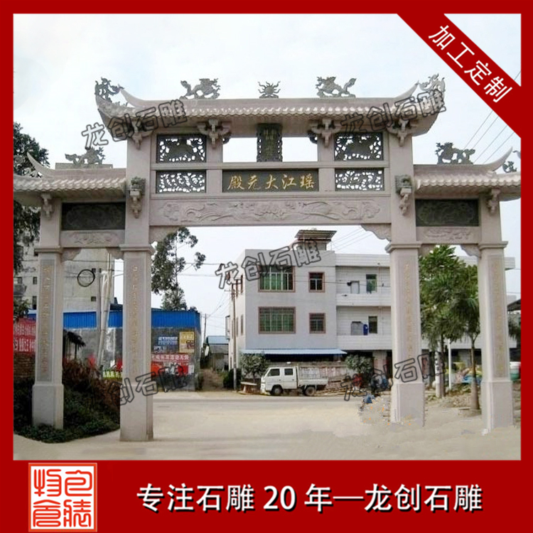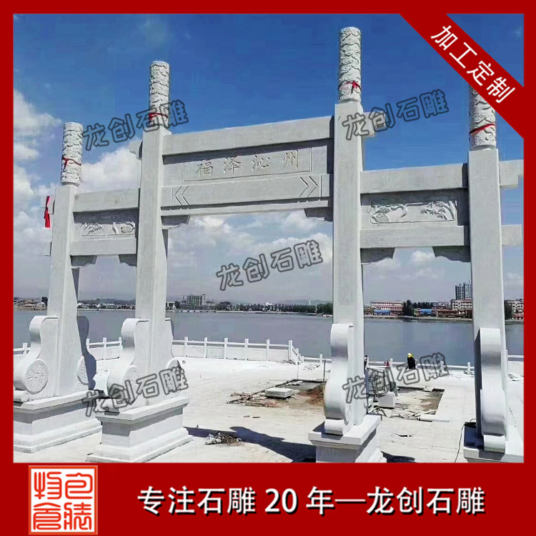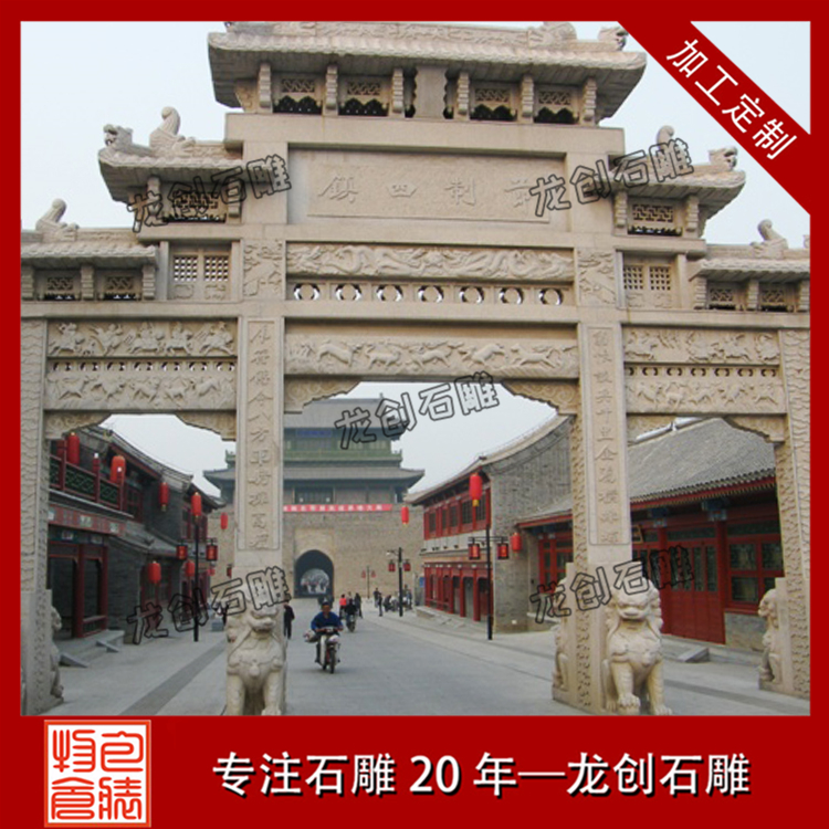 石雕牌樓作為中國有文化內(nèi)涵的古建筑之一,建在景區(qū)入口、寺廟入口、村莊入口居多,是一道值得欣賞的亮麗風(fēng)景線,石雕牌樓生產(chǎn)廠家,龍創(chuàng)石雕,生產(chǎn)各種樣式尺寸的石牌樓,質(zhì)優(yōu)價(jià)廉,歡迎直接來電咨詢選購。